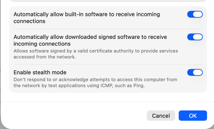 系统设置 → 网络 → 防火墙 → 打开 + 启用隐身模式